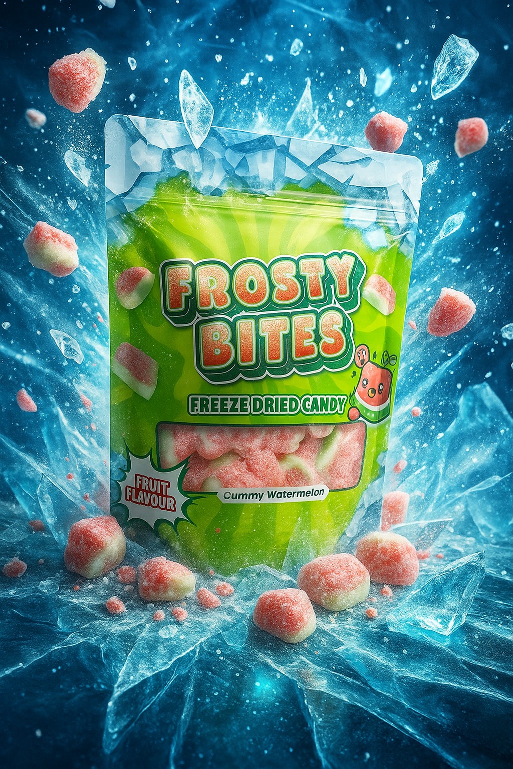 Die Frosty Bites Watermelon verwandeln klassische Wassermelonen-Gummis durch Freeze-Dry-Technologie in leichte, knusprige Fruchtbissen – intensiv im Geschmack und wunderbar luftig. Jeder Biss bietet die volle Erfrischung einer saftigen Wassermelone, nur mit einem aufregenden Crunch.