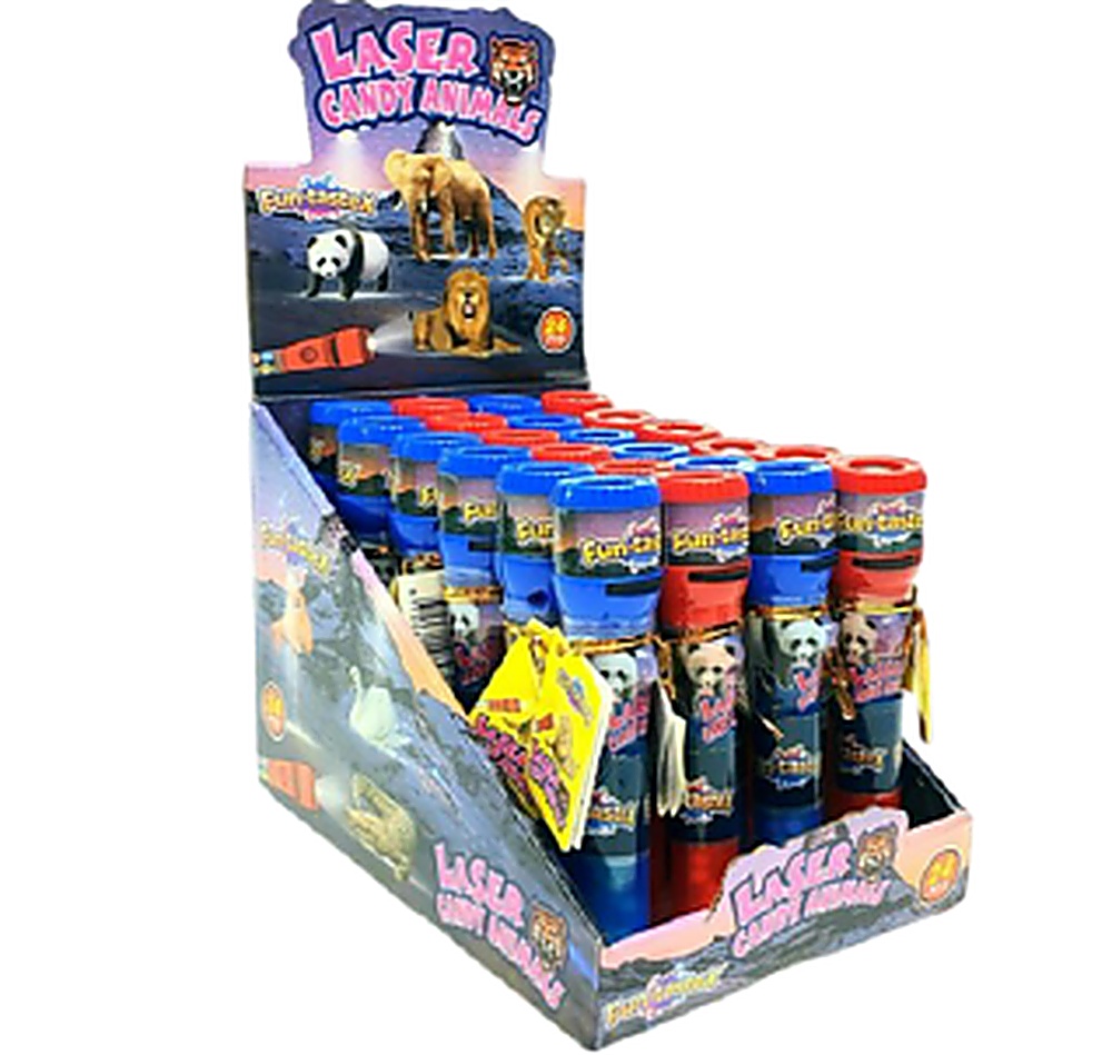 Die Laser Candy Animal vereint spannende Projektionen und Naschvergnügen: Im Griff des Spielzeugs steckt bunte Bonbonfüllung, oben sorgt ein Tiermotiv-Laser für Action.