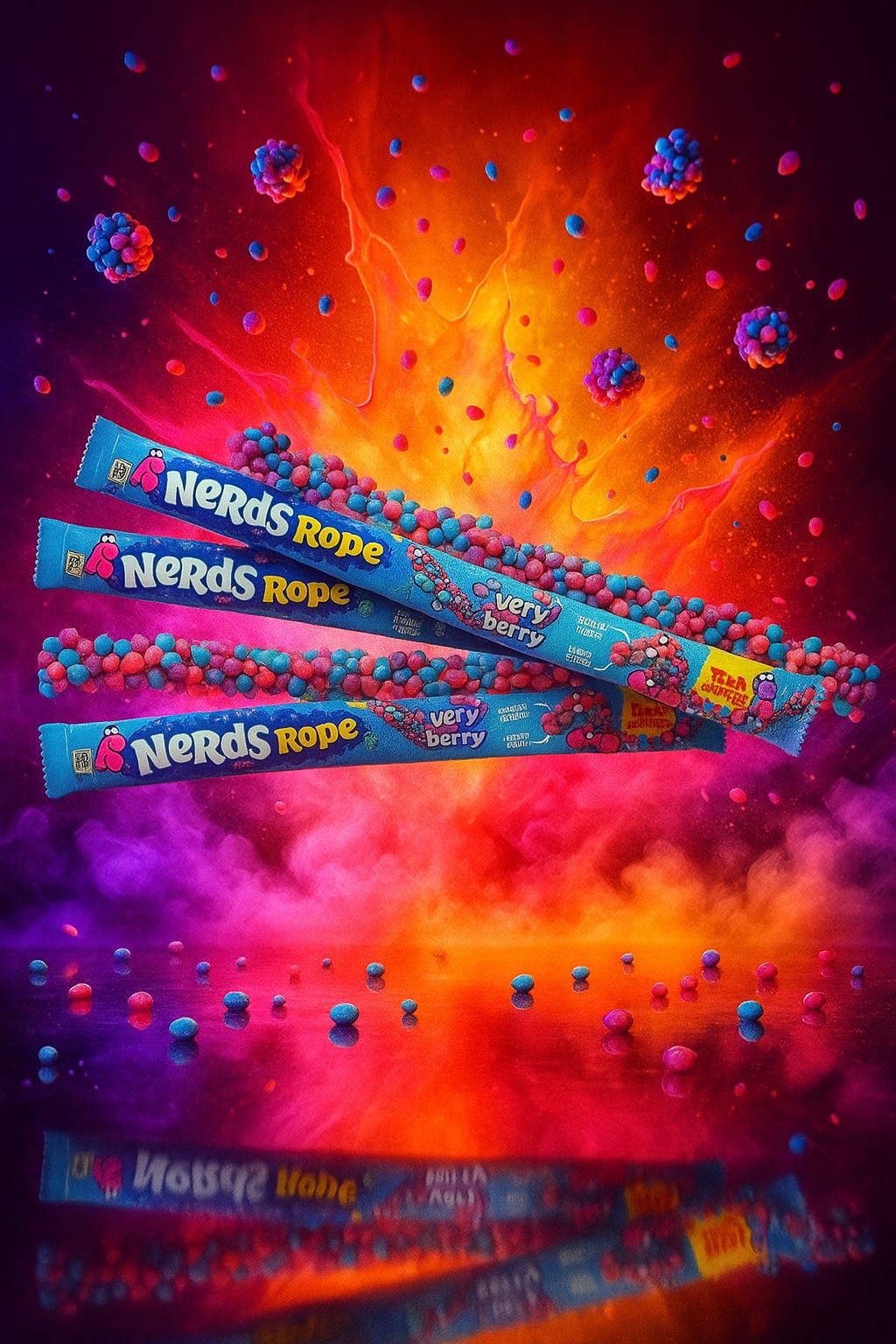 Ein weicher Fruchtgummi-Strang, umhüllt von knusprig-bunten Nerds-Dragees, sorgt für ein einzigartiges Nascherlebnis.