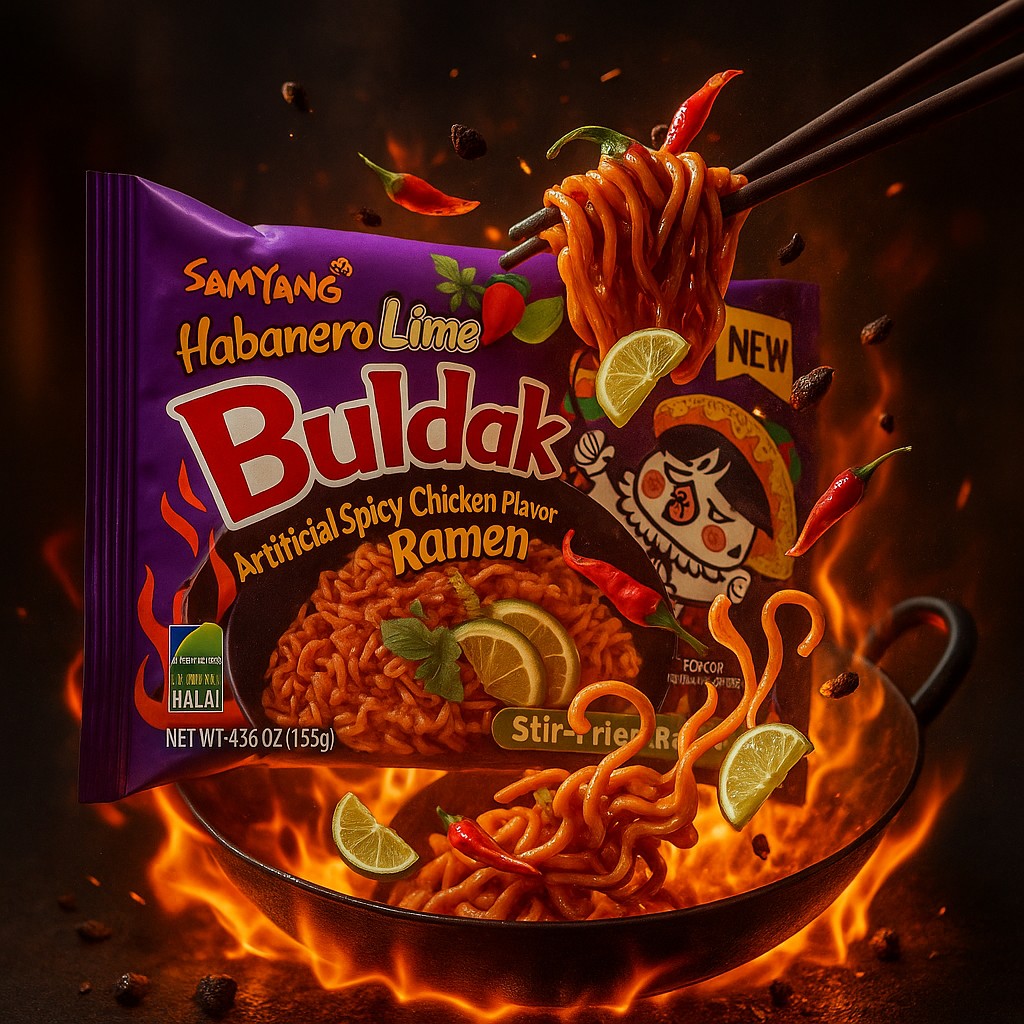 Weiche Stir-Fried-Nudeln treffen auf eine würzig-scharfe Sauce mit Habanero-Chili und frischer Limette – ein viraler Korea-Snack, der Feuer und Geschmack pur vereint.