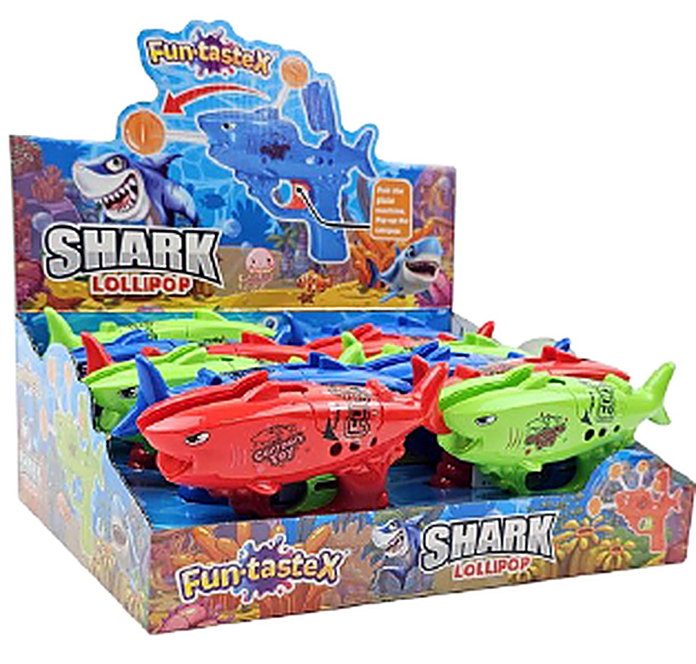 Der SHARK LOLLIPOP kombiniert Spielspass mit Naschfreude! Einfach den Knopf am Rücken drücken – und schon schiesst der Lolli aus dem Maul des Hais hervor.